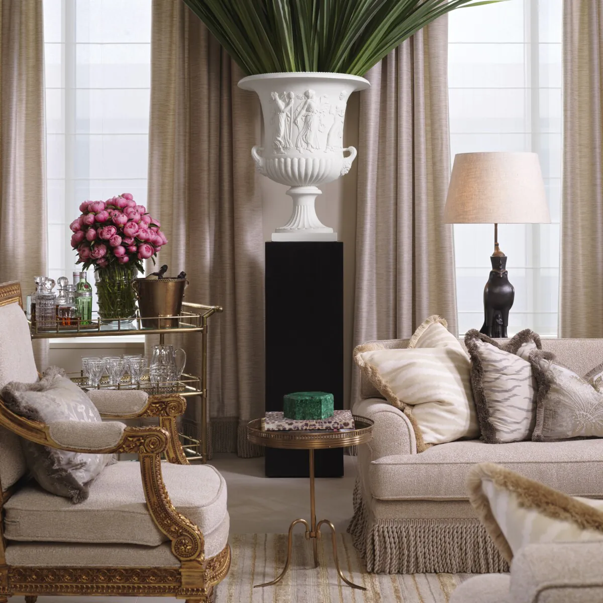 Phiên bản hiện đại này được bọc trong vải Sentier Cream cao cấp và hoàn thiện với lớp sơn vàng cổ tinh tế, mang đến vẻ sang trọng vượt thời gian, hòa quyện nghệ thuật cổ điển cùng phong cách xa hoa hiện đại.
