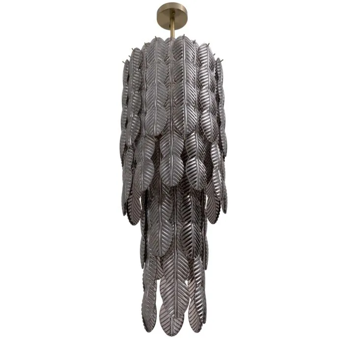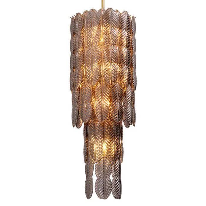 The Chandelier Sahure is inspired by the ancient Egyptian Palm Column of Sahure (ca. 2458–2446 B.C,.), which stood at over 21 feet high in its original state. The granite column that now stands in the Egyptian art galleries at The Metropolitan Museum of Art in New York is one of 16 that lined the perimeter of an open courtyard in the pyramid temple for the pharaoh Sahure. The tiered elements of the chandelier are presented in smoked glass with a brushed-brass finish for a sophisticated look.