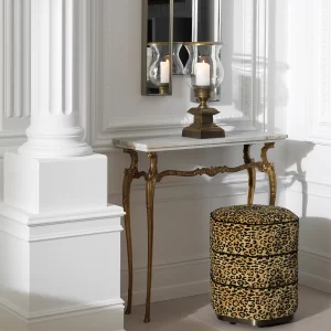 Fully upholstered in Bernard leopard fabric and set on a swivel base with a deep bronze finish, this versatile piece pairs comfort with a playful sense of sophistication. Whether used as additional seating or as a standalone accent, its sculptural silhouette and tactile upholstery make it a striking presence in both classic and contemporary interiors.